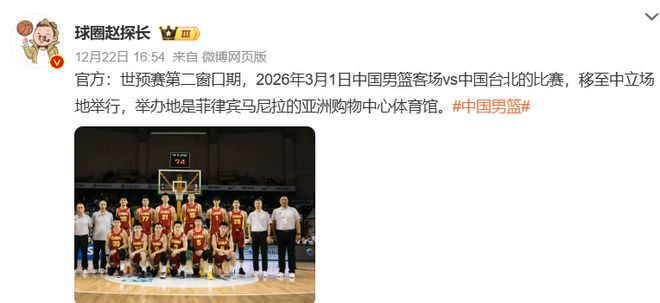 值得一提的是,明年3月1日中国男篮VS中国台北队的比赛,将移至中立场地举办,地点位于菲律宾马尼拉的亚洲购物中心体育馆。至于为什么?FIBA官方尚未给出解释,但懂的都懂,现在的体育运动早已不纯粹,掺杂了太多不可控因素,只能尽量避免。